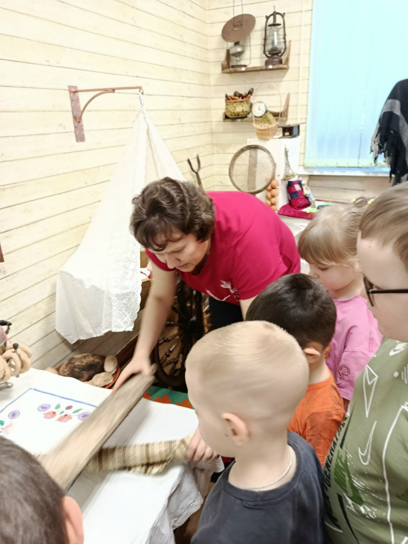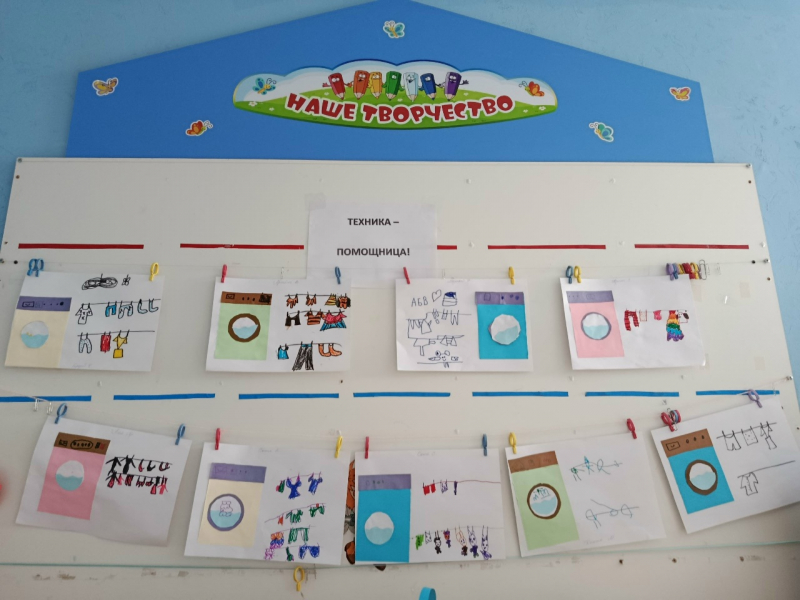 Педагоги с детьми рассматривали иллюстрации по данной теме, провели беседы и загадывали загадки. Побывали в нашем музее "Лента времени", где педагог Екатерина Николаевна Астахова провела увлекательную экскурсию в прошлое. Дети с интересом рассматривали такие старинные предметы, как - рубель, утюг, ступа и доска для стирки белья. Дети на наглядном примере убедились, что современная техника действительно творит чудеса и облегчает процесс труда. Свои знания они отразили в творческой деятельности.